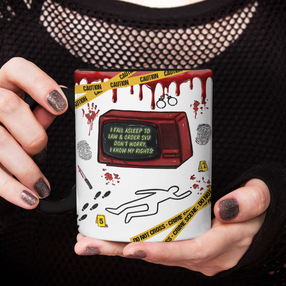 Channel your inner detective with this bold ceramic mug, inspired by crime scene aesthetics. Featuring caution tape, chalk outlines, and a vintage TV flashing: “I fall asleep to Law & Order SVU. Don’t worry, I know my rights!” Perfect for late-night binge-watchers and SVU fans, this mug is sturdy, dishwasher safe, and built to hold your fuel for marathon mystery sessions.