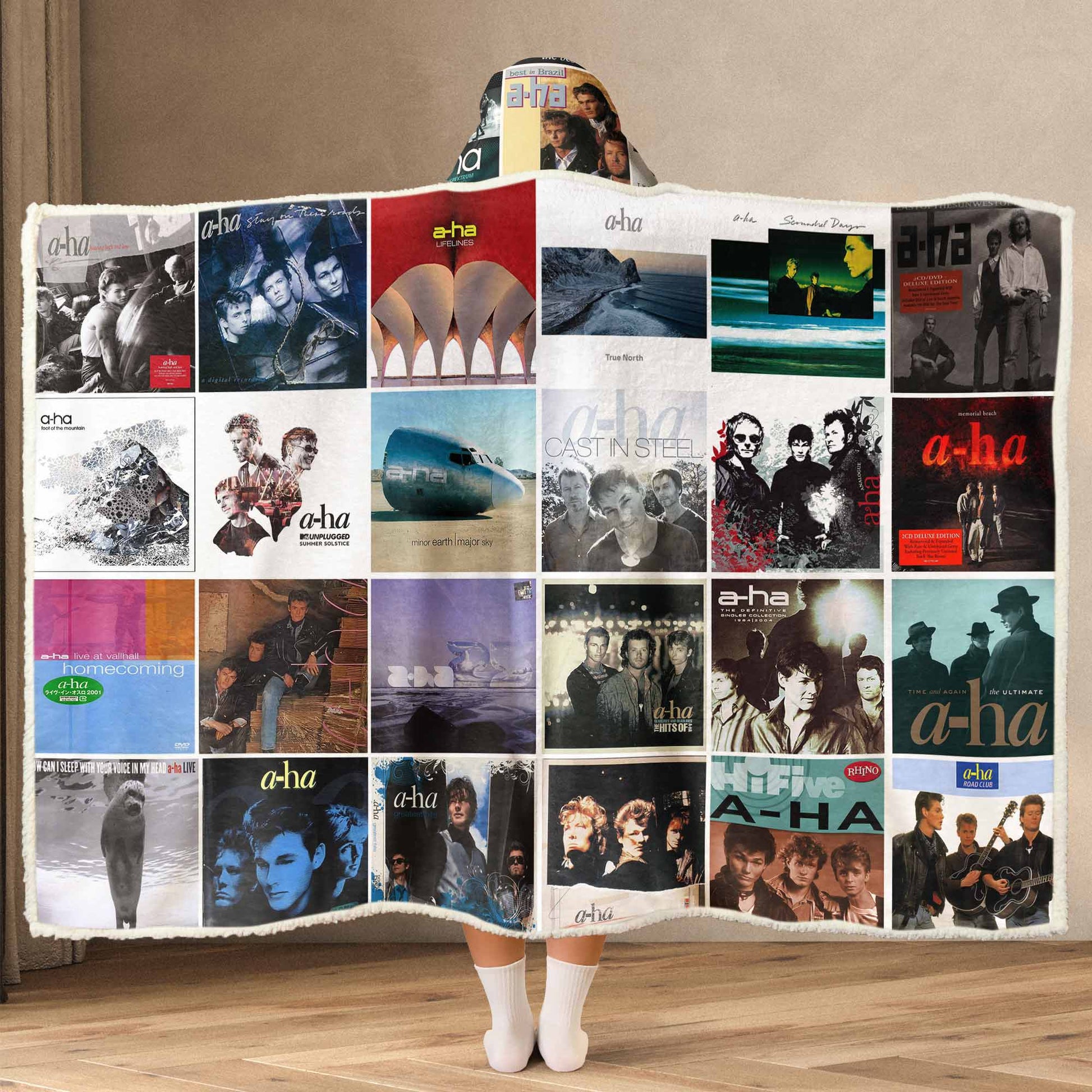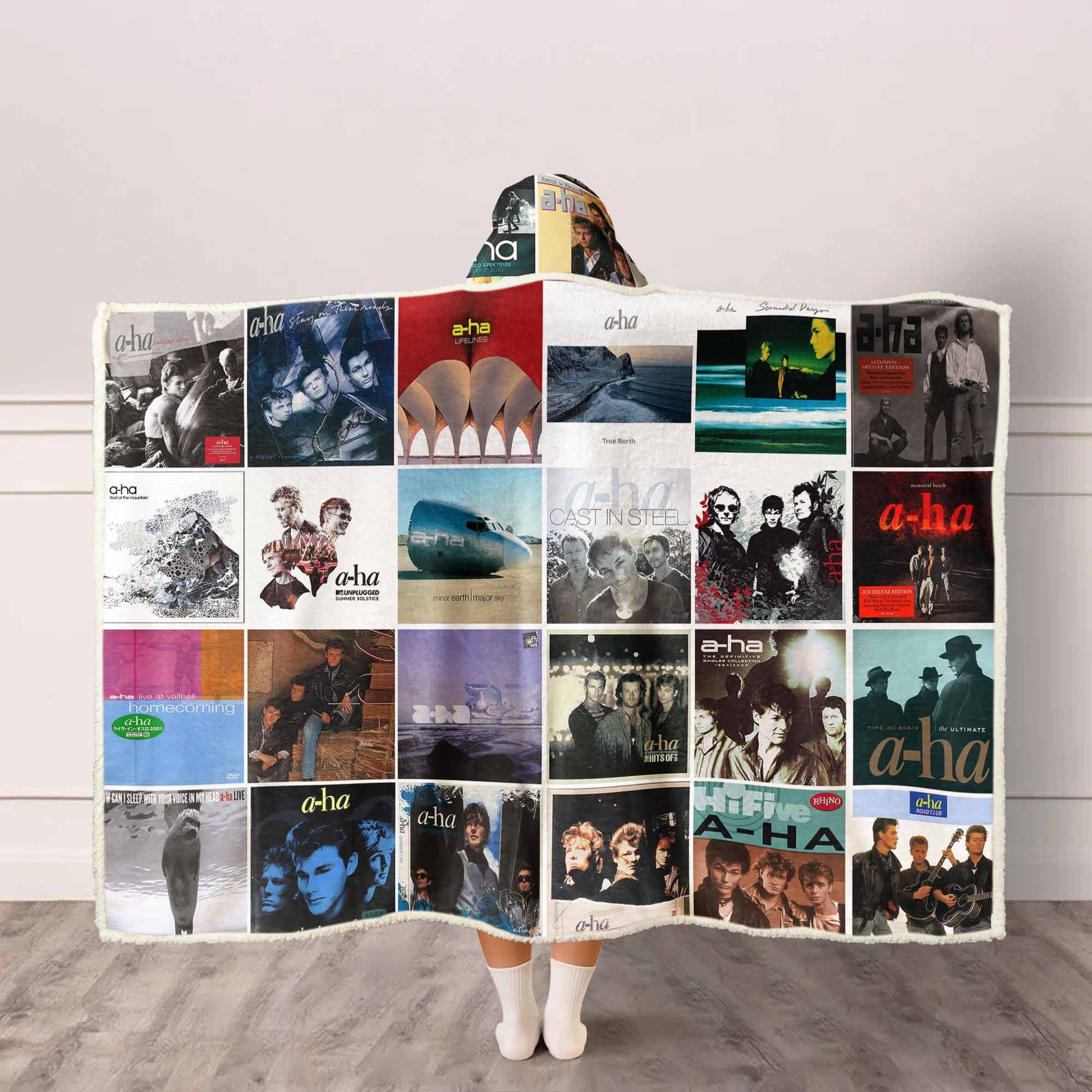 Step into pure 80s nostalgia with this A-ha wearable hooded blanket — a cozy tribute to one of the most iconic synth-pop bands of all time. Featuring a collage of their classic album covers, from Hunting High and Low to Stay on These Roads and beyond, this blanket wraps you in both warmth and timeless music history.
