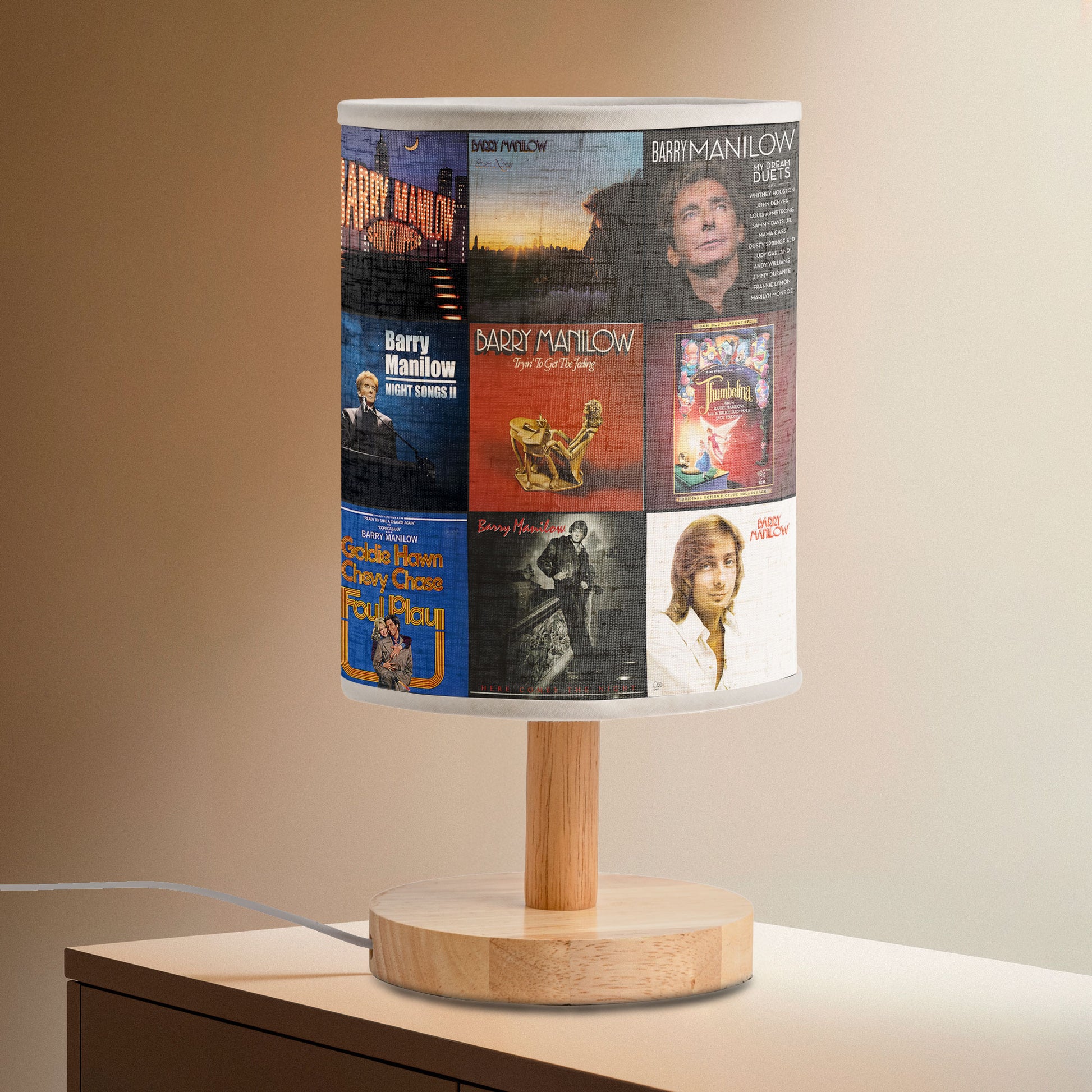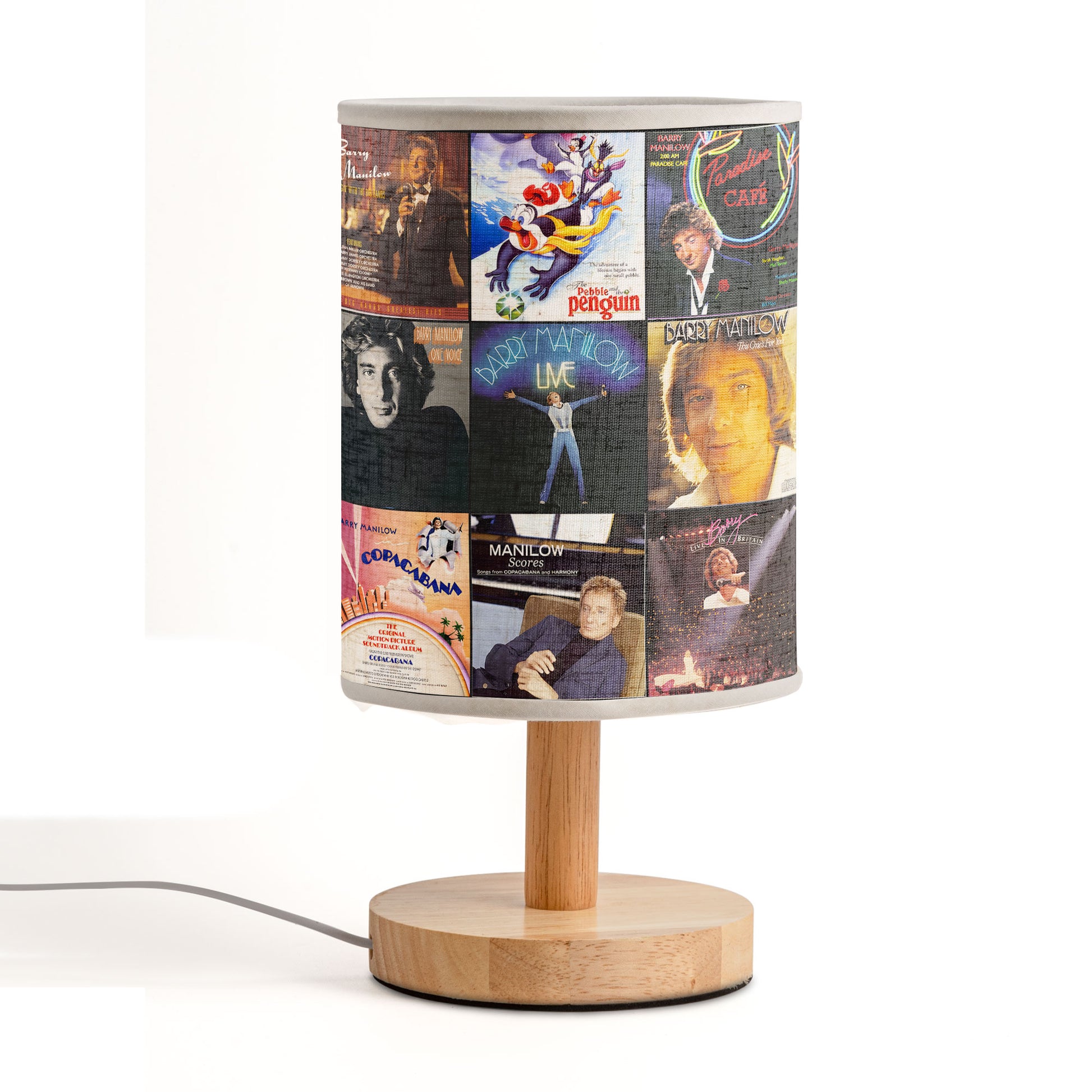 Light up your room with timeless melodies and golden-era charm with this Barry Manilow Album Collage Lamp. Featuring iconic album covers from the legendary singer-songwriter behind hits like Mandy and Copacabana, this lamp radiates warmth, romance, and nostalgia. A perfect decor piece for music lovers who cherish the magic of classic pop and soft rock. Bring home the glow of the golden ‘70s and ‘80s—bright, sentimental, and beautifully vintage.