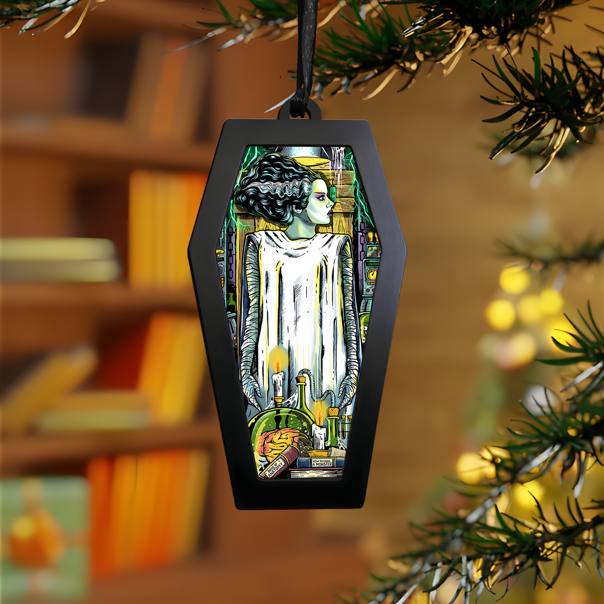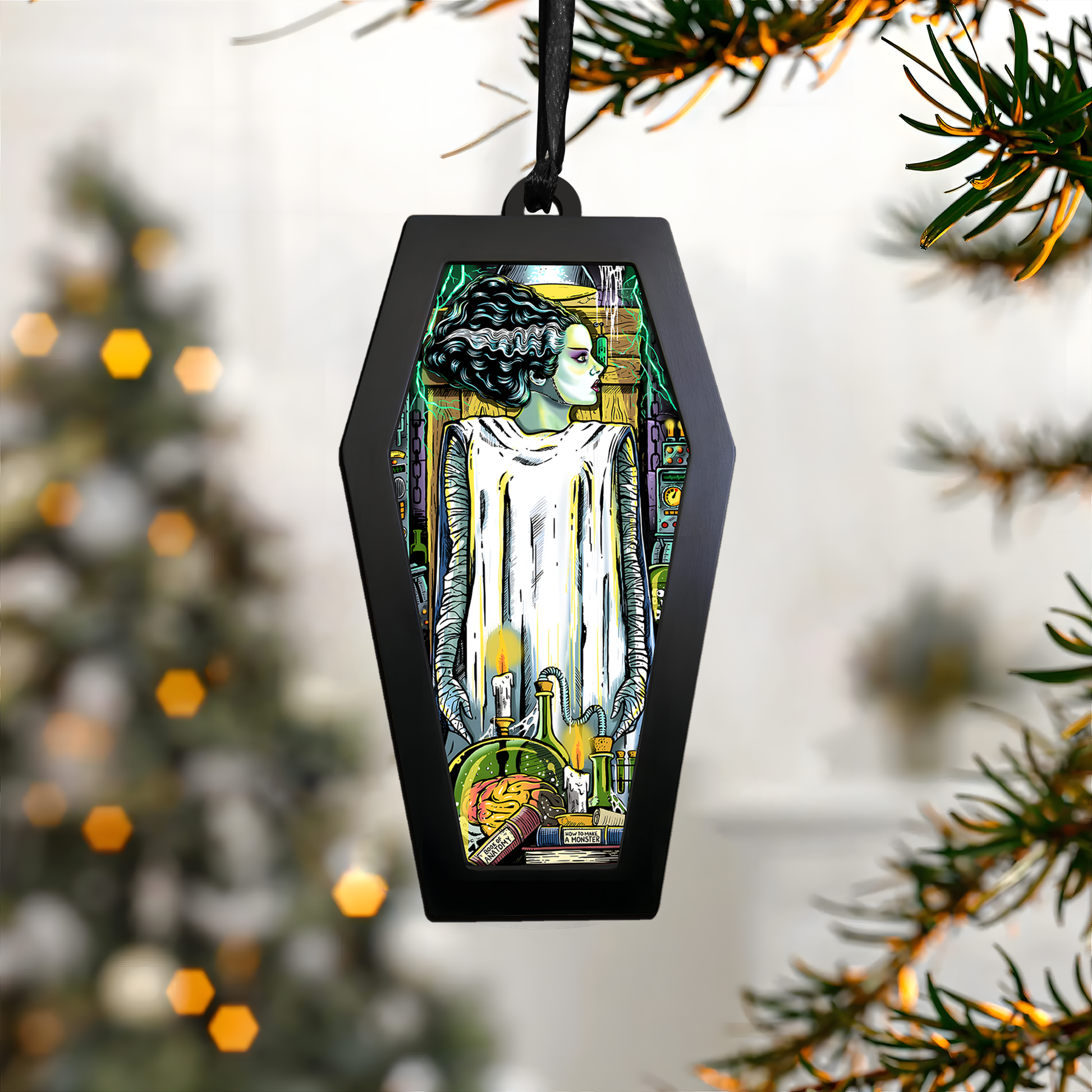 Captures the iconic Bride of Frankenstein in a striking side profile, surrounded by laboratory details, glowing candles, and potion bottles, all enclosed in a distinctive coffin-shaped frame that radiates gothic elegance.