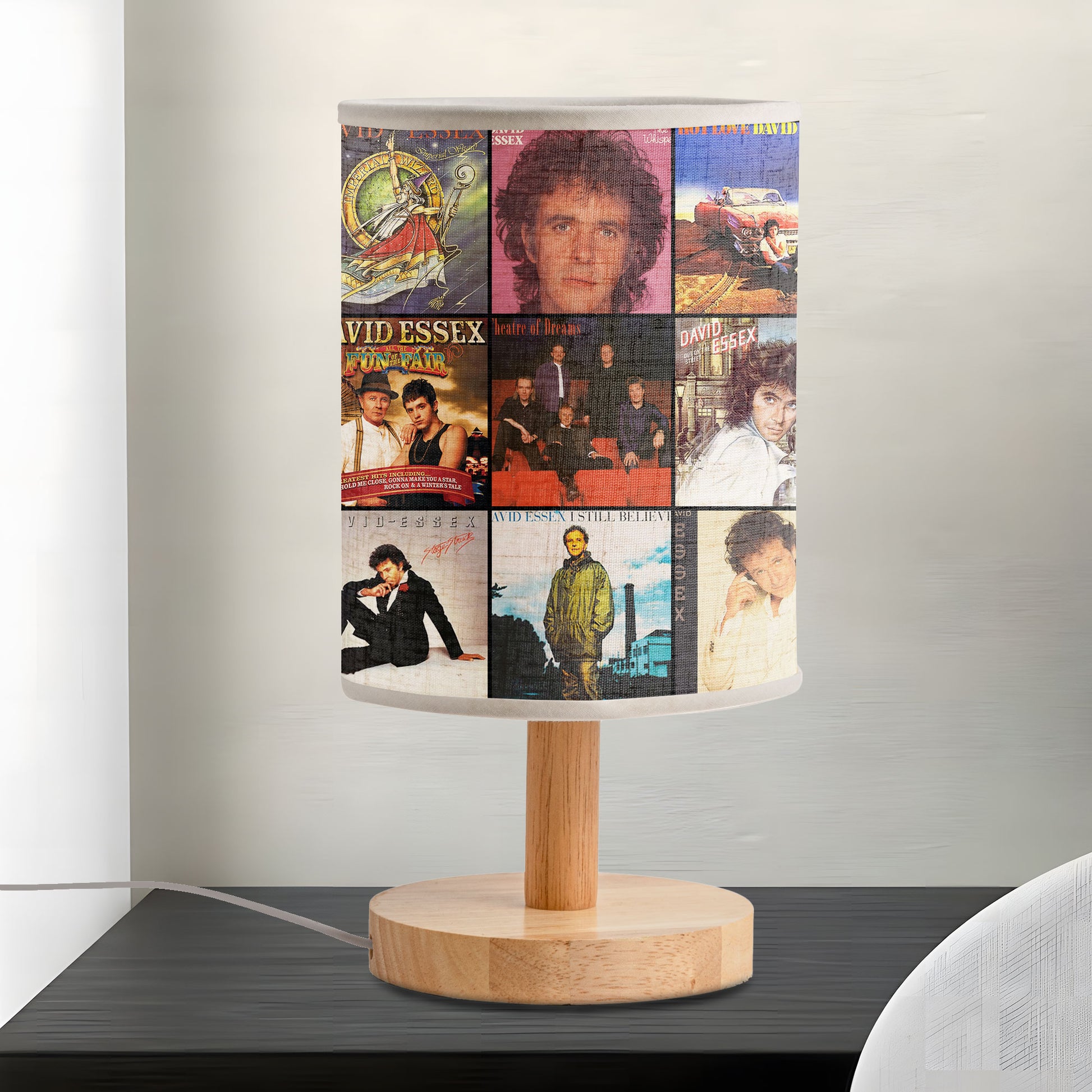 Bring a touch of retro charm into your space with the David Essex Fabric Lamp, featuring a stunning collage of his most iconic album covers — from Rock On to A Night at the Movies.
