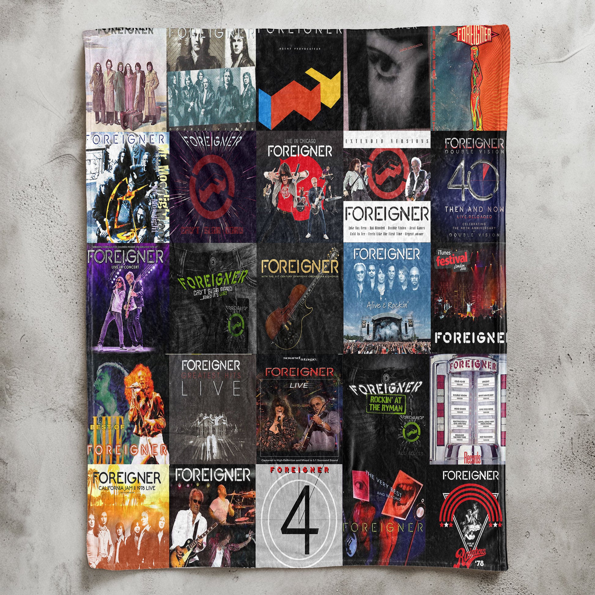 Wrap yourself in the powerhouse legacy of Foreigner with this ultra-cozy Sherpa blanket, featuring a bold collage of their most iconic album covers and live-era artwork. From arena-rock classics to unforgettable anthems, every panel celebrates the band’s electrifying history. A perfect gift for longtime fans who want to keep the spirit of classic rock alive—warmly and in style.