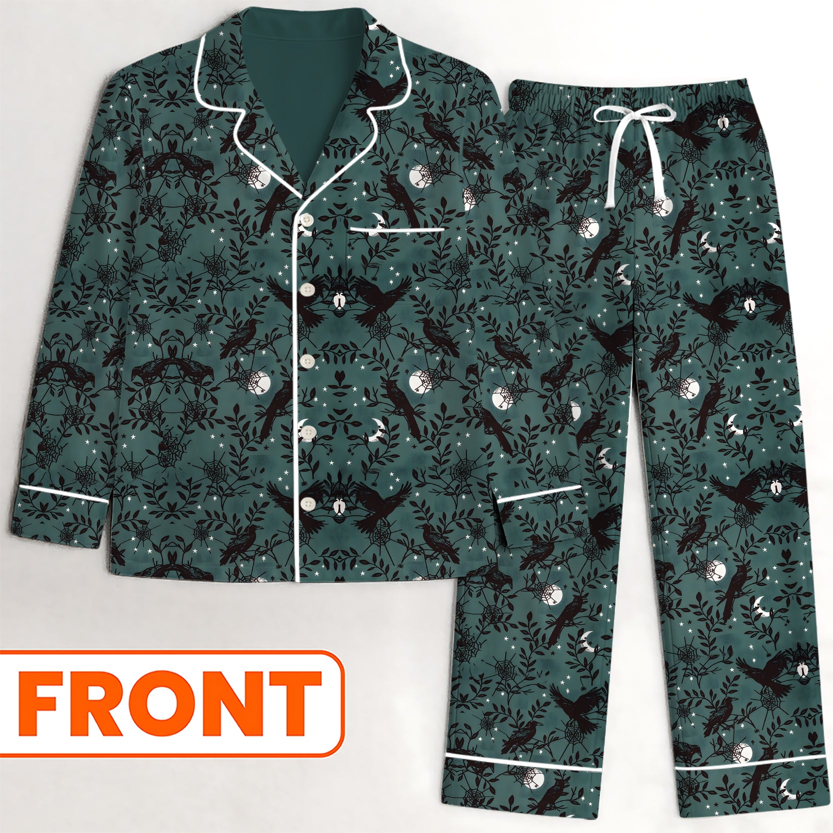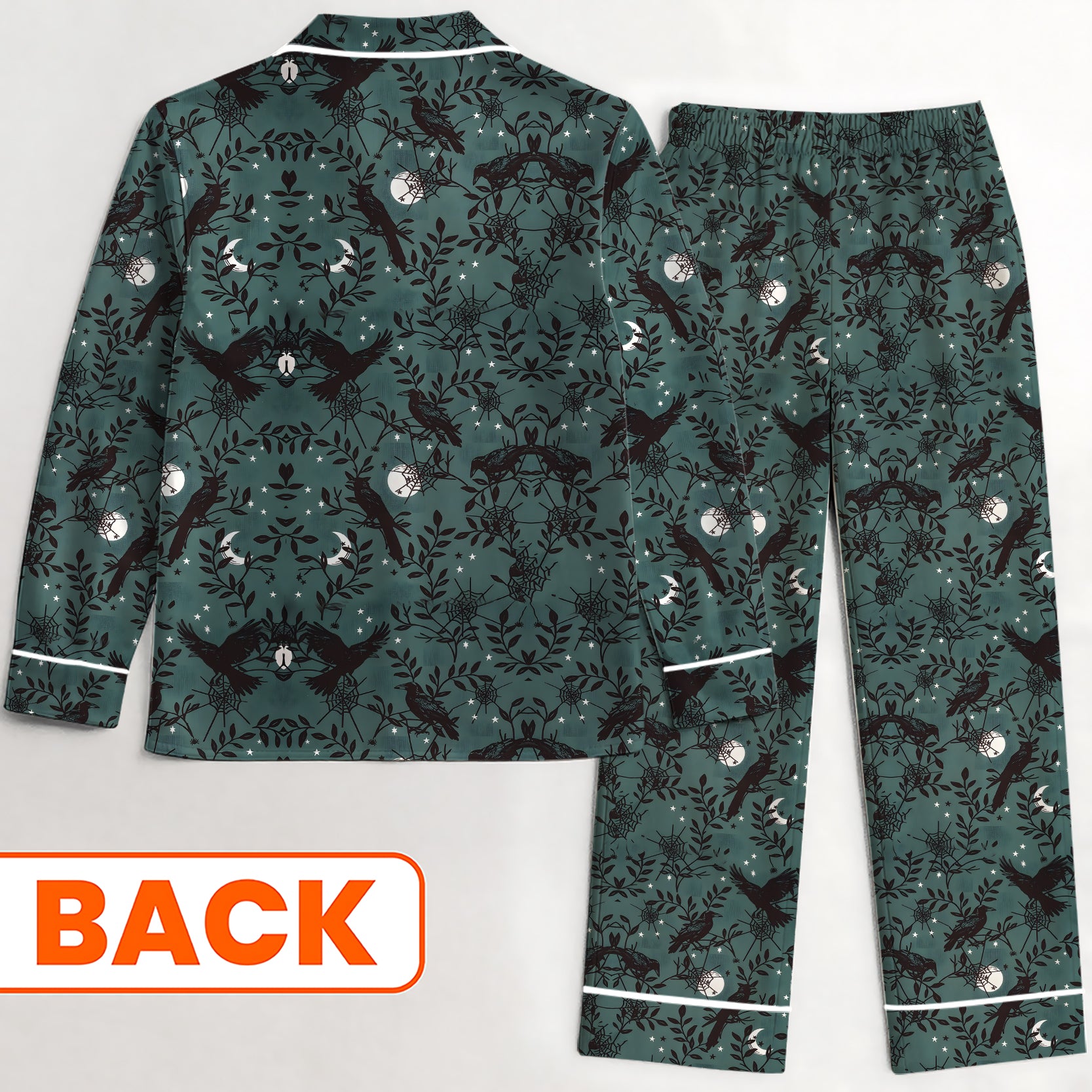 This gothic pajama set features a dark and elegant pattern of ravens, spiderwebs, and leaves — perfect for fans of Halloween vibes, dark academia, and gothic literature.