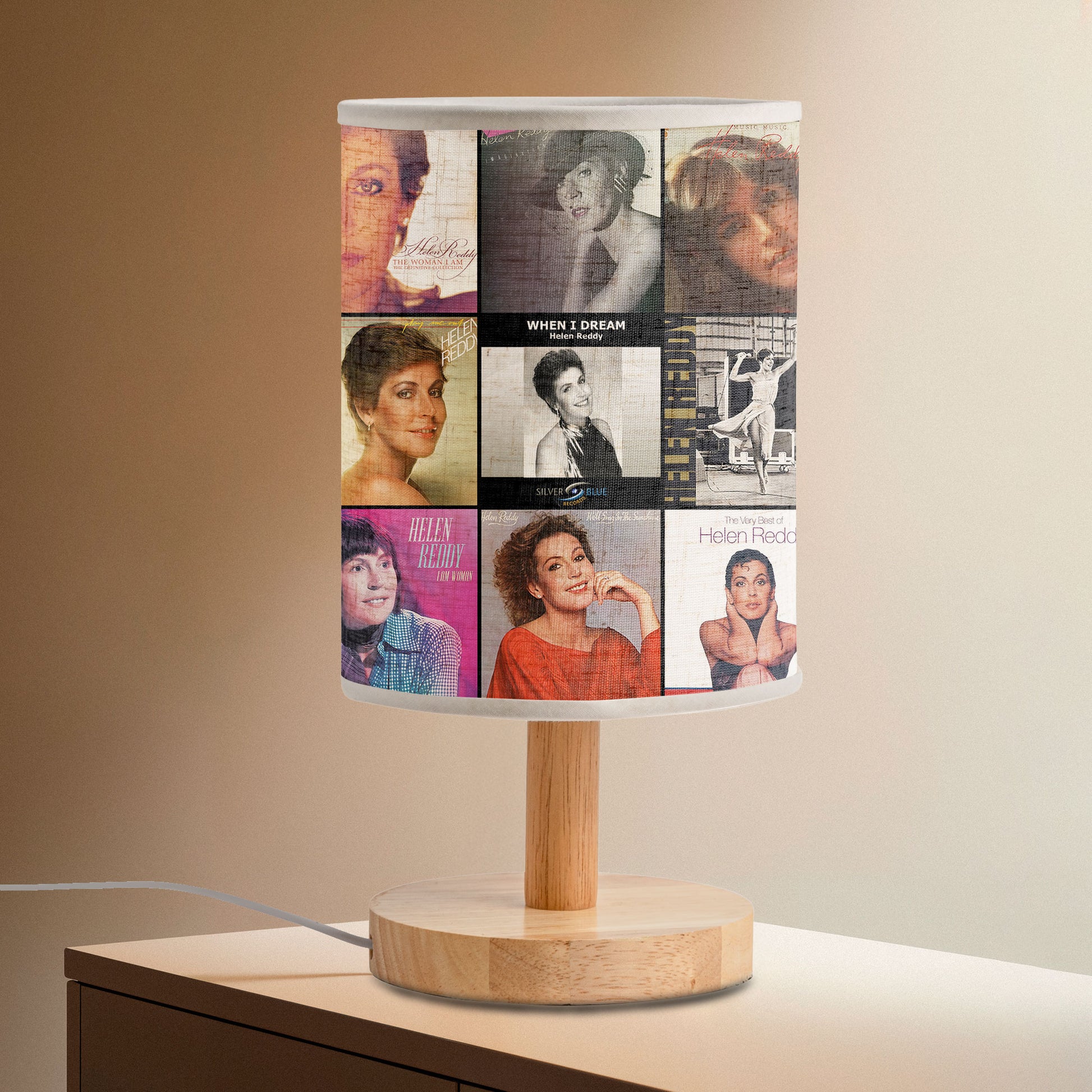 This fabric lamp features a collage of iconic album covers by Helen Reddy, bringing back the warmth of classic melodies and timeless memories. When lit, it creates a soft, nostalgic glow—perfect for music lovers who grew up with her songs and want to keep those moments close in everyday life.
