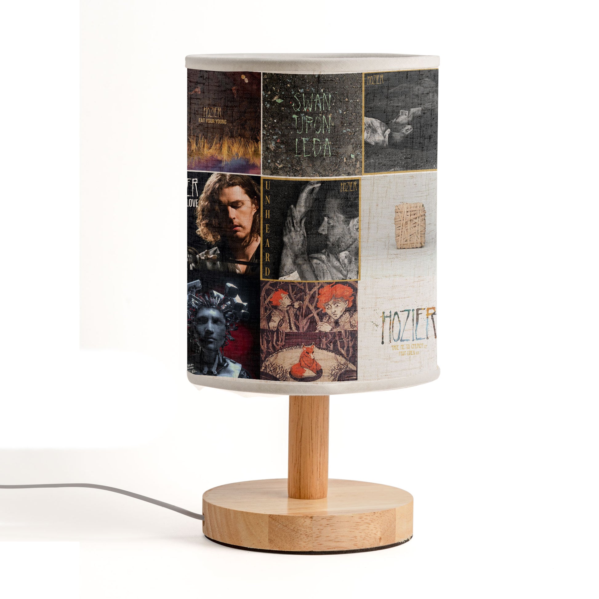 Bring the ethereal beauty and emotional depth of Hozier's music into your space with this captivating table lamp featuring a stunning collage of his iconic album covers. Perfect for fans of "Take Me to Church" and soulful indie folk rock.