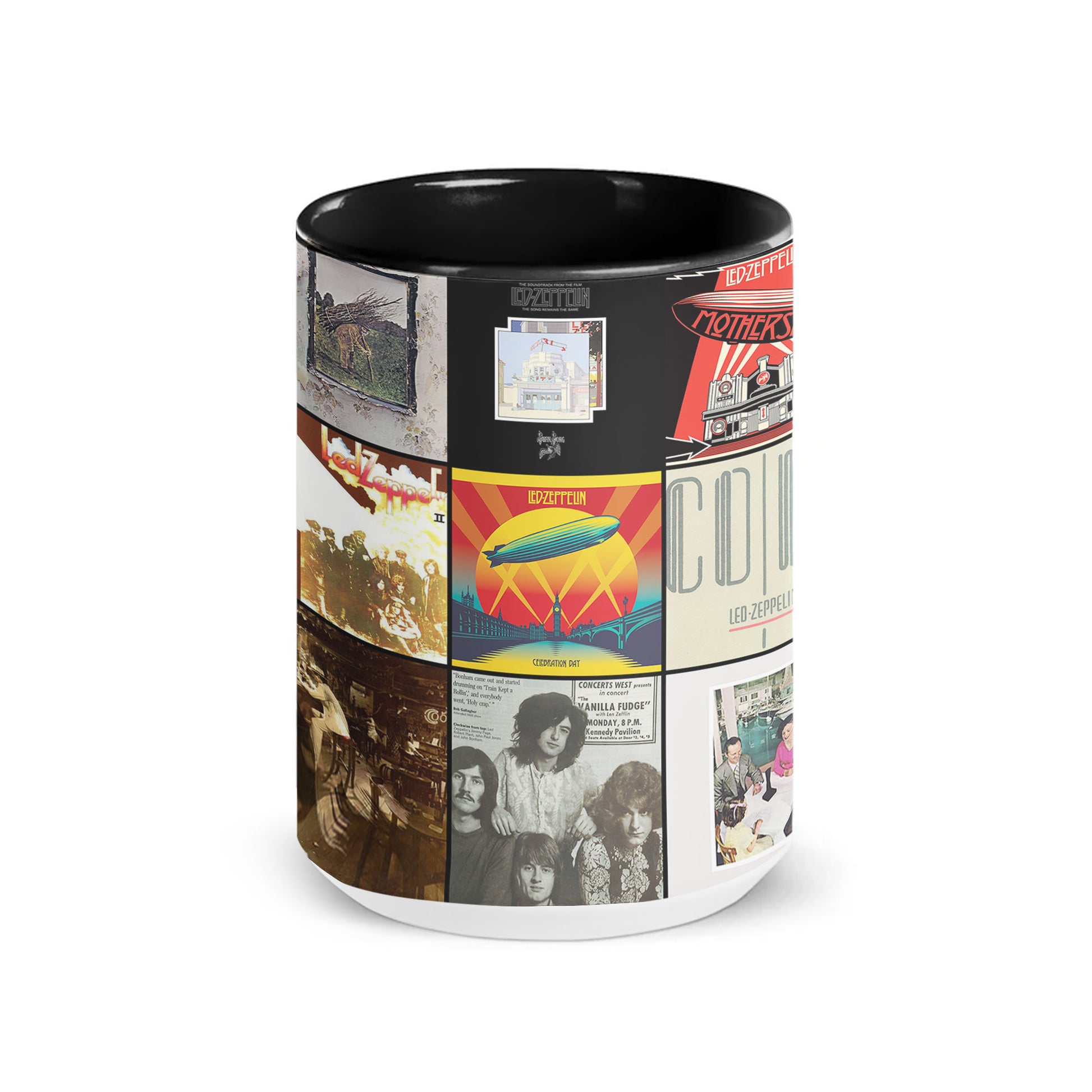 Start your morning with legendary rock vibes! This Led Zeppelin Accent Mug showcases a vibrant collage of iconic album covers, printed in crisp, high-quality detail. Featuring a bold black interior and handle, it’s perfect for coffee, tea, or displaying as part of your music collection. A thoughtful and unique gift for any devoted Led Zeppelin fan.
