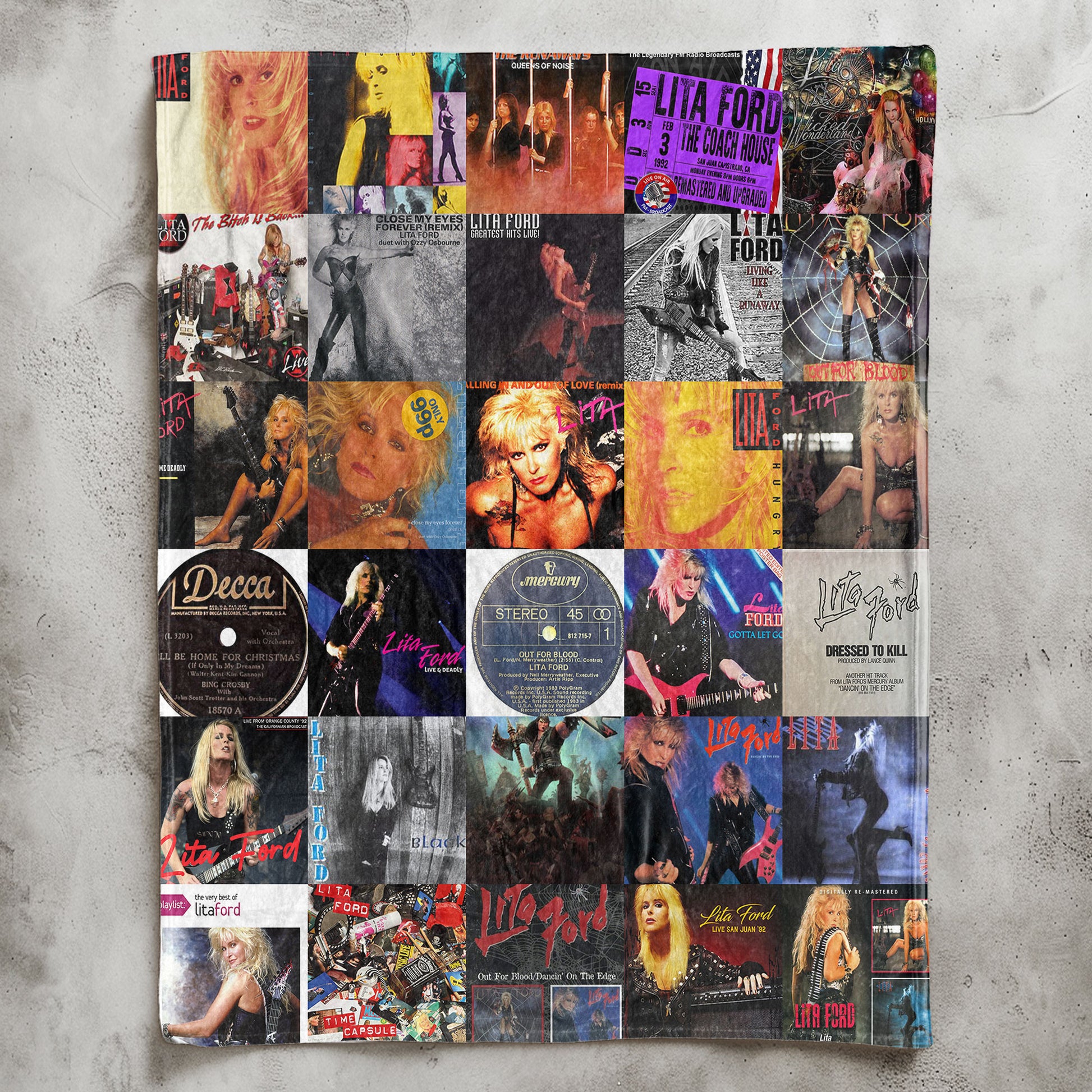 Turn up the heat in your home with this ultra-cozy Sherpa blanket celebrating the legendary Lita Ford. Featuring a bold collage of her most iconic album covers—from glam-metal fury to powerhouse ballads—this blanket captures her unapologetic attitude and electric stage presence. A perfect gift for any die-hard Lita fan who loves their rock loud and their comfort soft.