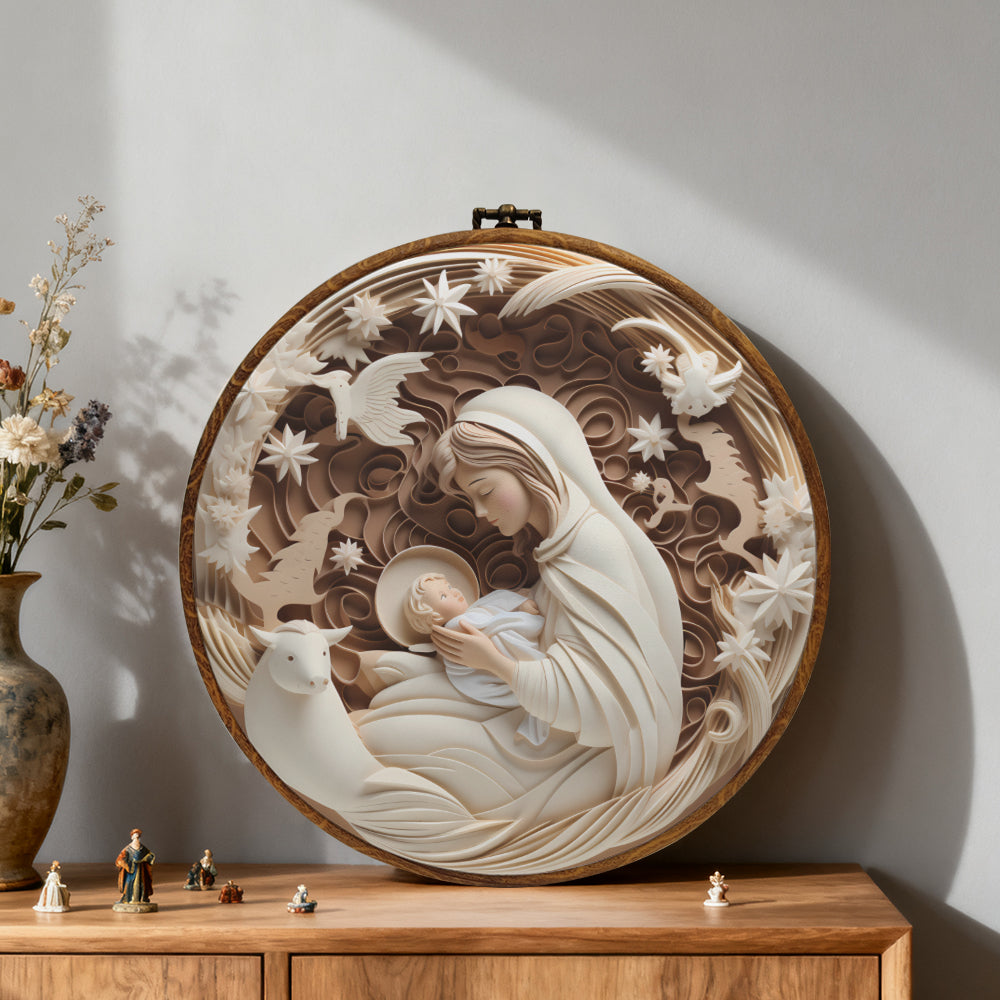 Embrace the tenderness of the Holy Night with this Madonna and Child Framed Round Wall Art, crafted in a stunning paper sculpture style. The delicate layers capture the Virgin Mary cradling baby Jesus, surrounded by stars, doves, and gentle animals — symbolizing peace, purity, and divine love.