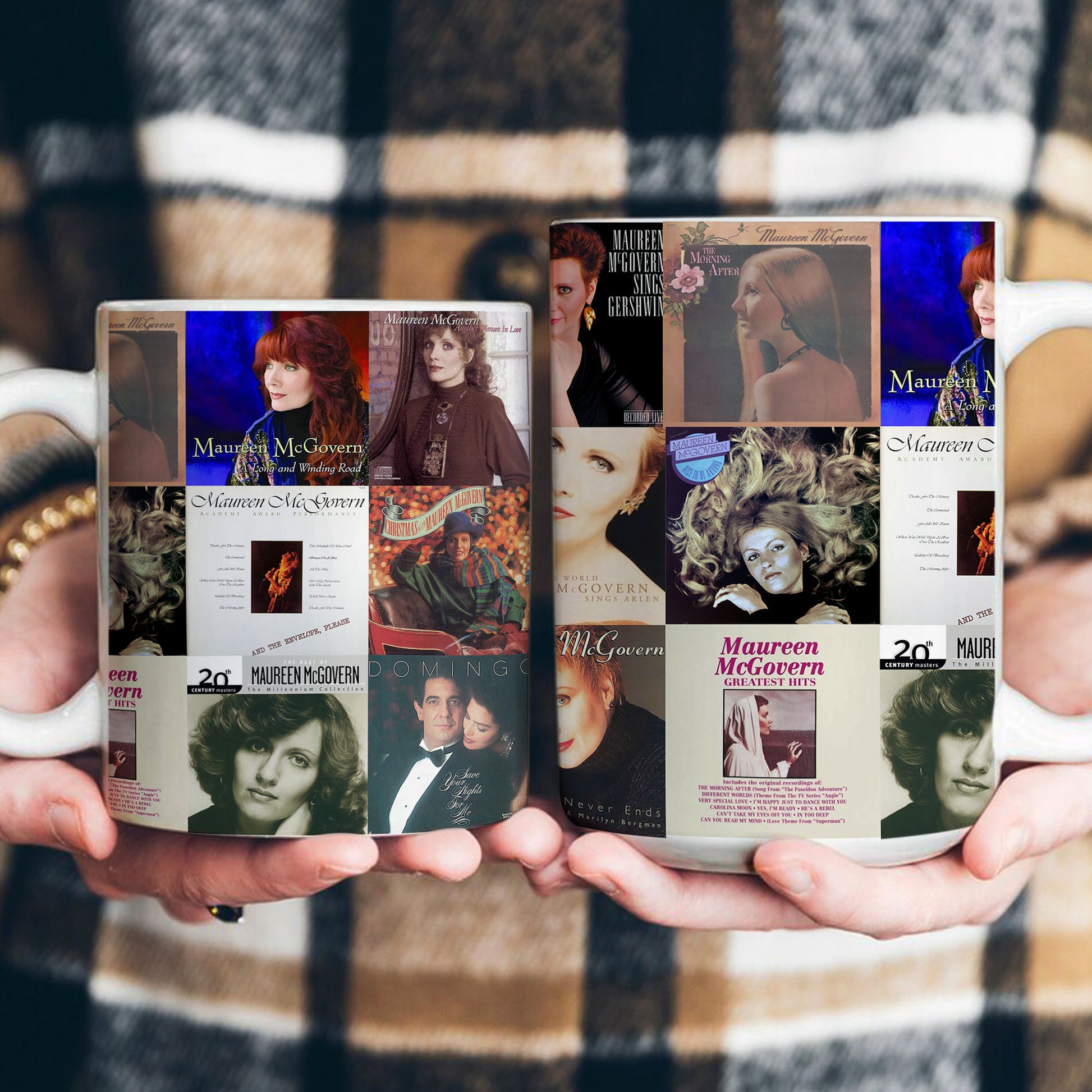 A nostalgic accent mug featuring a collage of Maureen McGovern’s most beloved album covers—perfect for fans of timeless vocals, elegant ballads, and classic American music. A cozy daily companion for coffee moments filled with warmth and vintage charm.