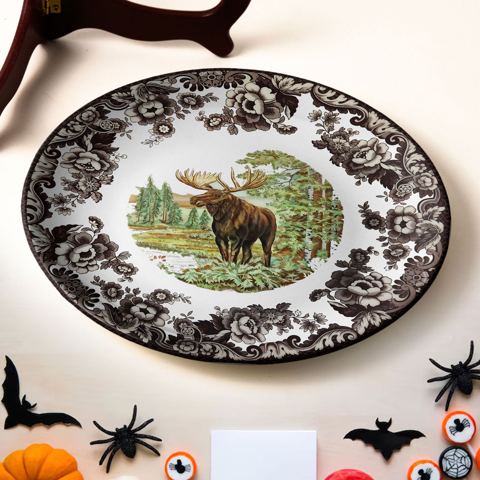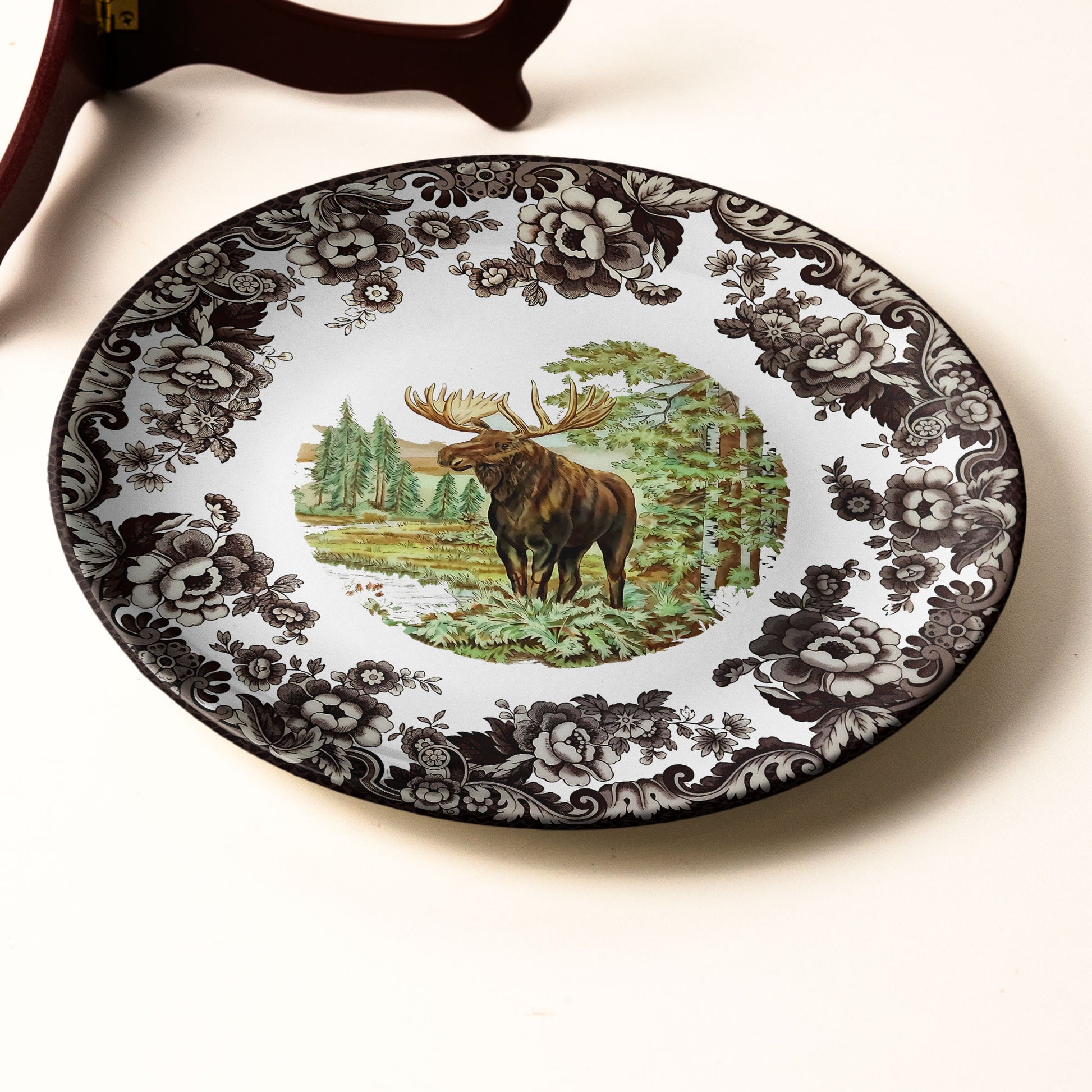 Celebrate the beauty of the wilderness with this decorative plate featuring a majestic moose standing proudly in a lush forest clearing. The central scene is surrounded by an intricate floral border in earthy tones, blending elegance with rustic charm. Perfect for nature lovers and collectors, this piece captures the serene spirit of the great outdoors and brings a timeless woodland touch to your home decor.