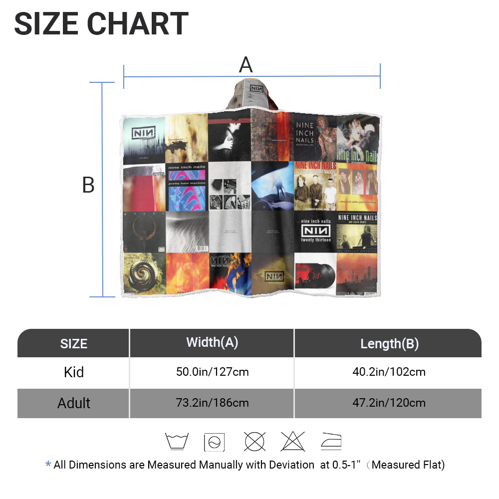 Celebrate the dark energy of Nine Inch Nails with this Album Art Wearable Hooded Blanket, featuring iconic covers from every era. Perfect for fans of Trent Reznor’s sound and style — bold, edgy, and unforgettable.