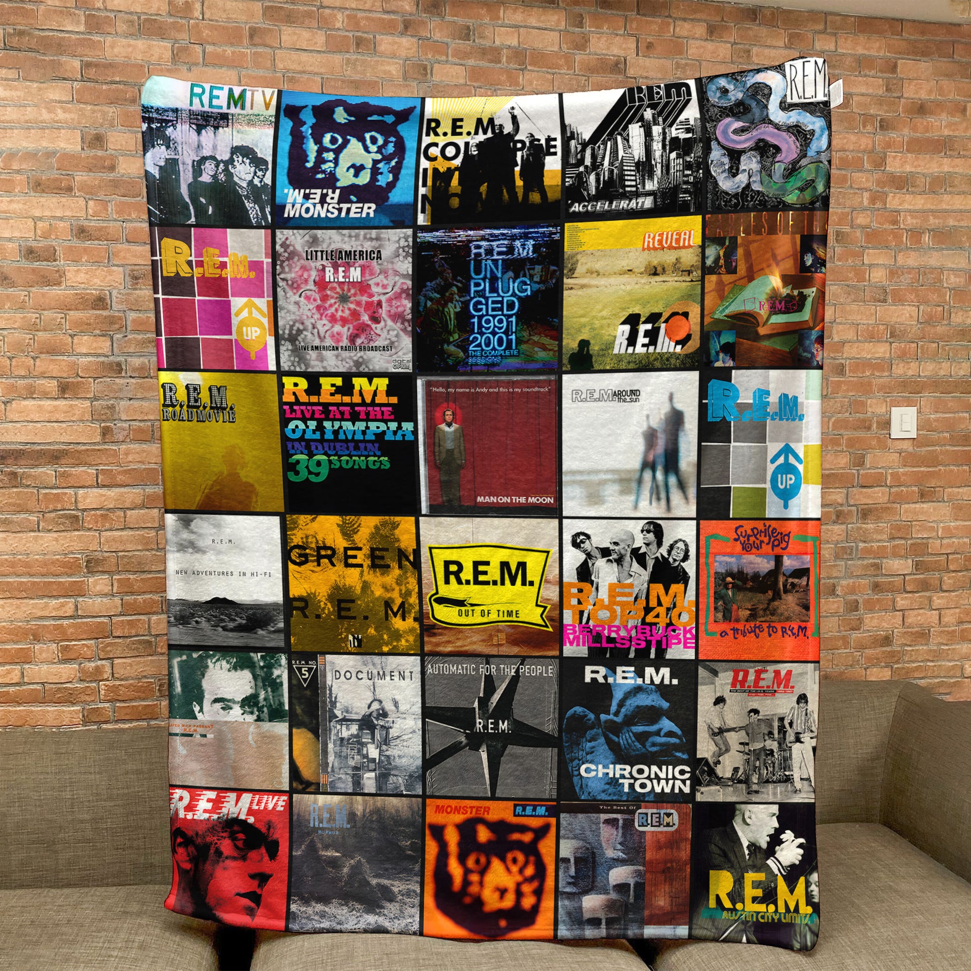 Celebrate the legacy of R.E.M. with this ultra-soft Sherpa blanket featuring a vibrant collage of their most iconic album covers. A perfect nostalgic keepsake for true fans of the legendary alt-rock band.