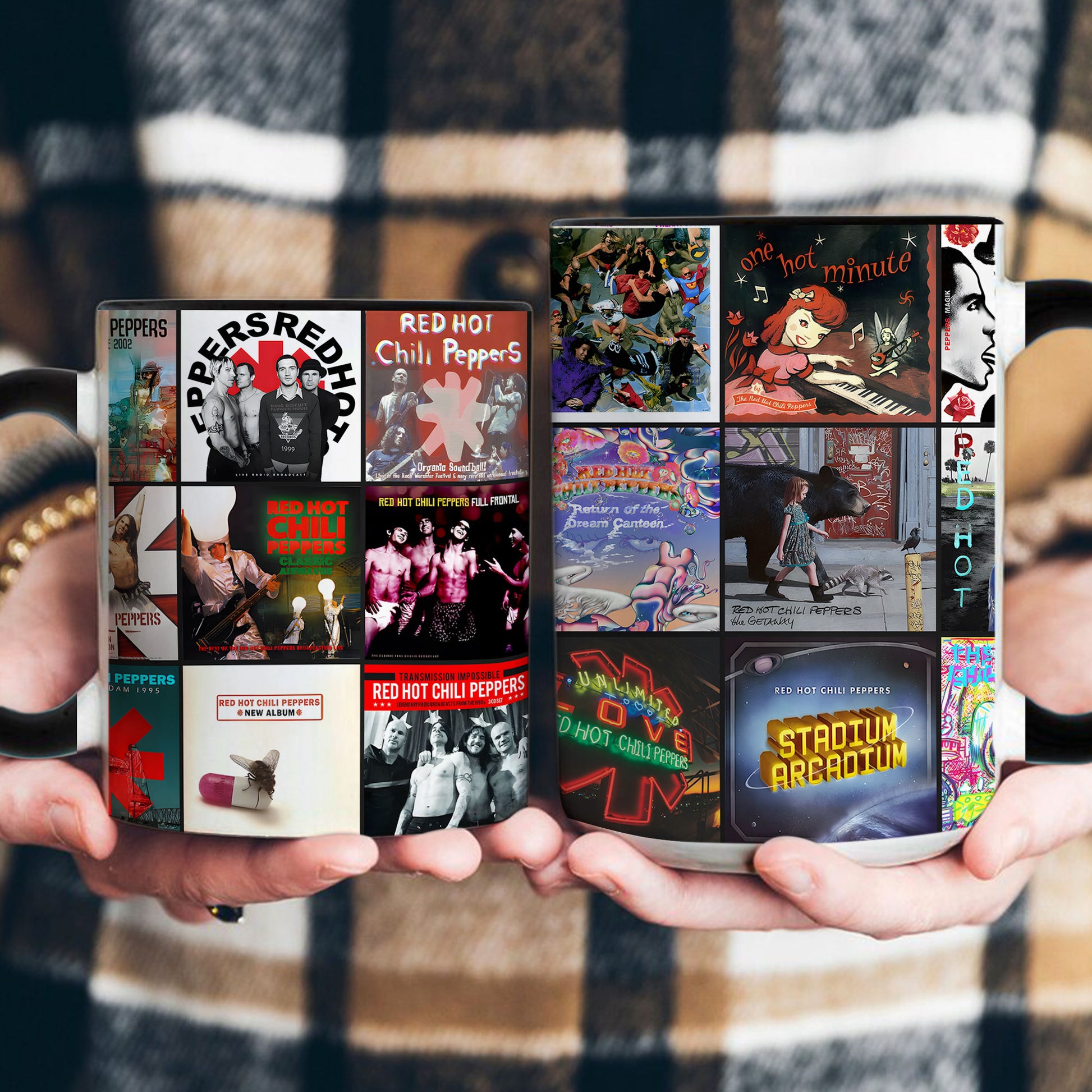 A vibrant Accent Mug featuring a collage of iconic Red Hot Chili Peppers album covers. Perfect for music lovers and collectors, this mug adds bold personality to every sip and makes a thoughtful, memorable gift for any RHCP fan.