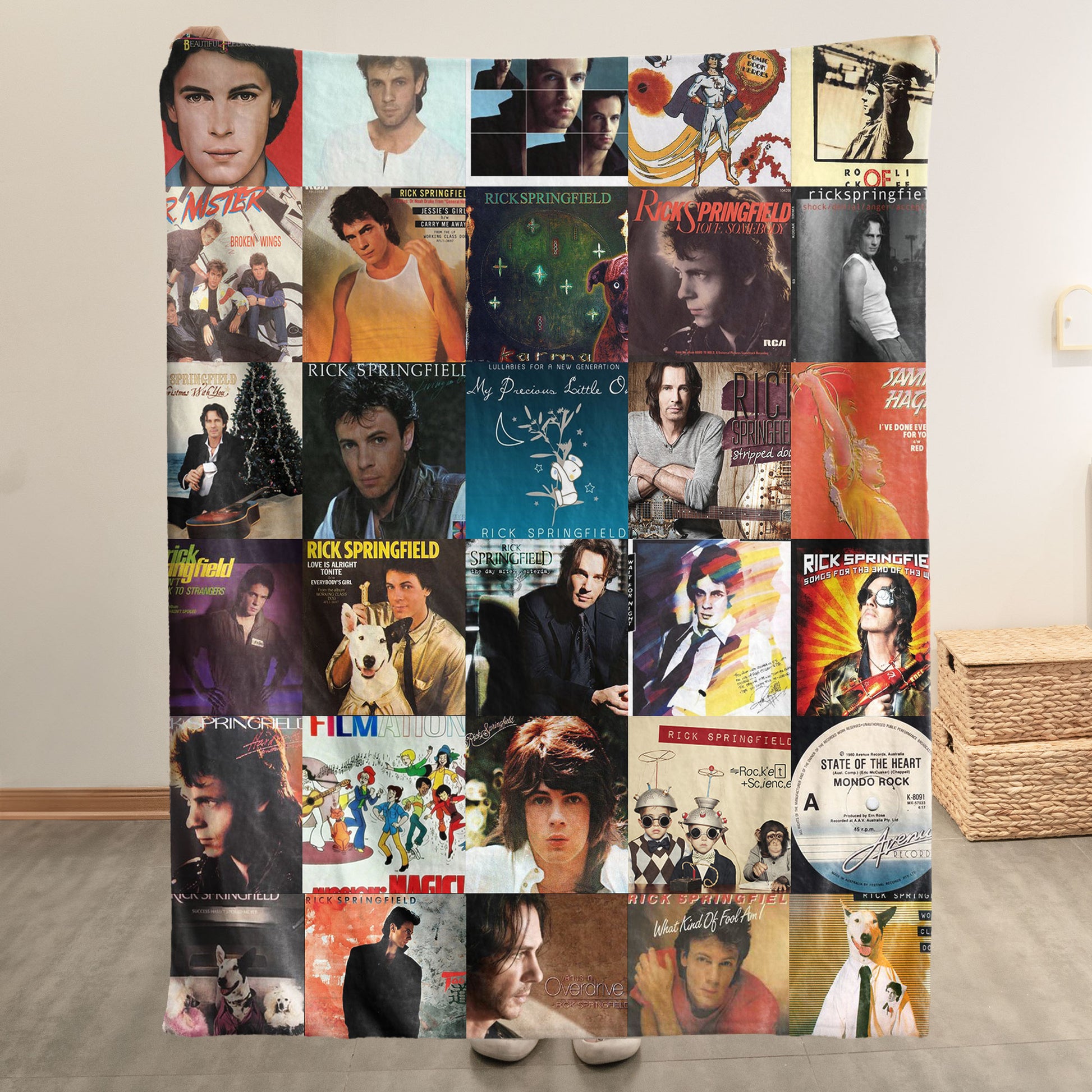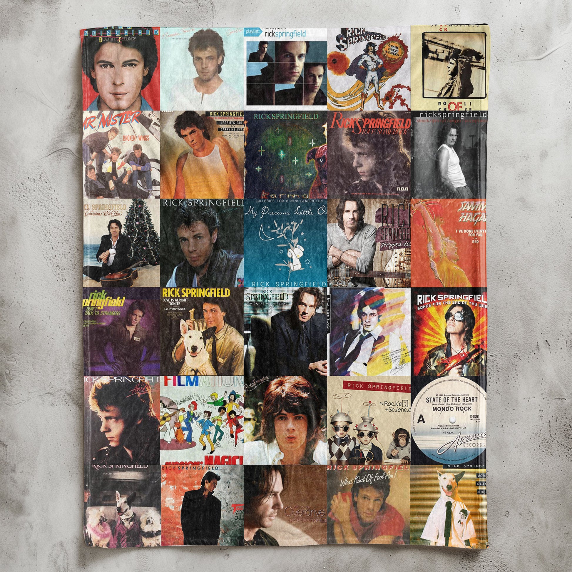 Wrap yourself in nostalgia with this ultra-soft sherpa blanket featuring a vibrant collage of Rick Springfield’s most iconic album and single covers. From Working Class Dog to Success Hasn't Spoiled Me Yet and beyond, this blanket is made for fans who still feel the magic of those timeless hits.