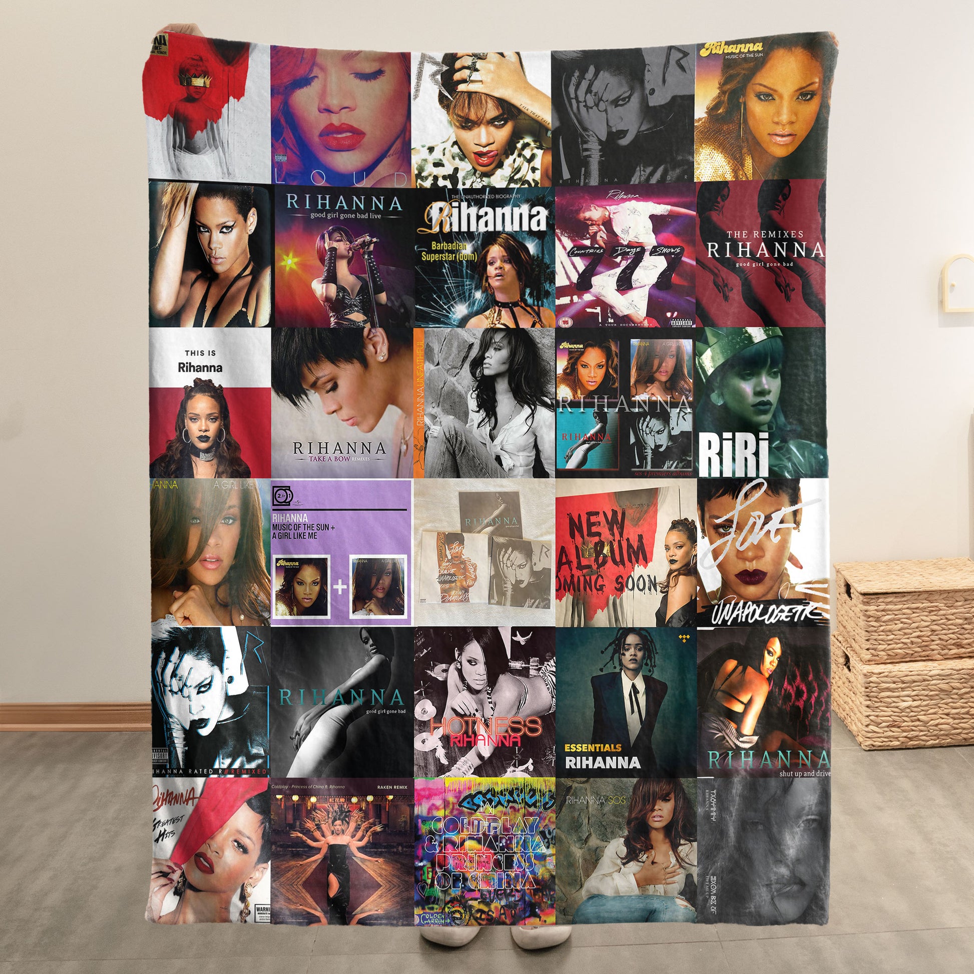 Wrap yourself in the evolution of Rihanna’s legendary era-spanning artistry with this Sherpa blanket. Featuring an electrifying collage of her most unforgettable albums and visuals, it captures the attitude, glamour, and fearless creativity that made RiRi a global icon. Perfect for fans who want to feel the vibe, the edge, and the magic—every single day.
