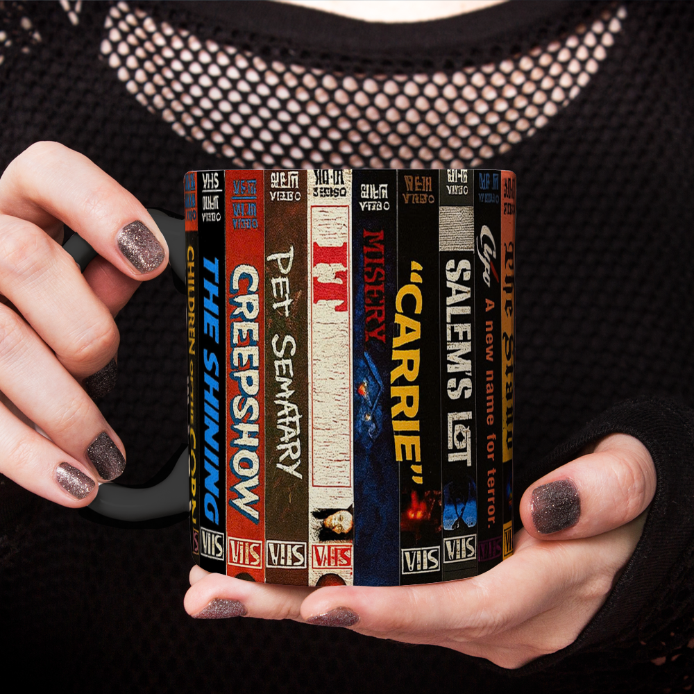 Relive the spine-chilling magic of Stephen King’s most iconic stories with this retro VHS-themed mug. Wrapped in vintage-style tape spines, it celebrates the unforgettable adaptations that have haunted audiences for decades, making it the perfect drinkware for horror lovers and collectors of classic cinema. The Shining, Creepshow, Pet Sematary, It, Misery, Carrie, Salem’s Lot, A New Name for Terror