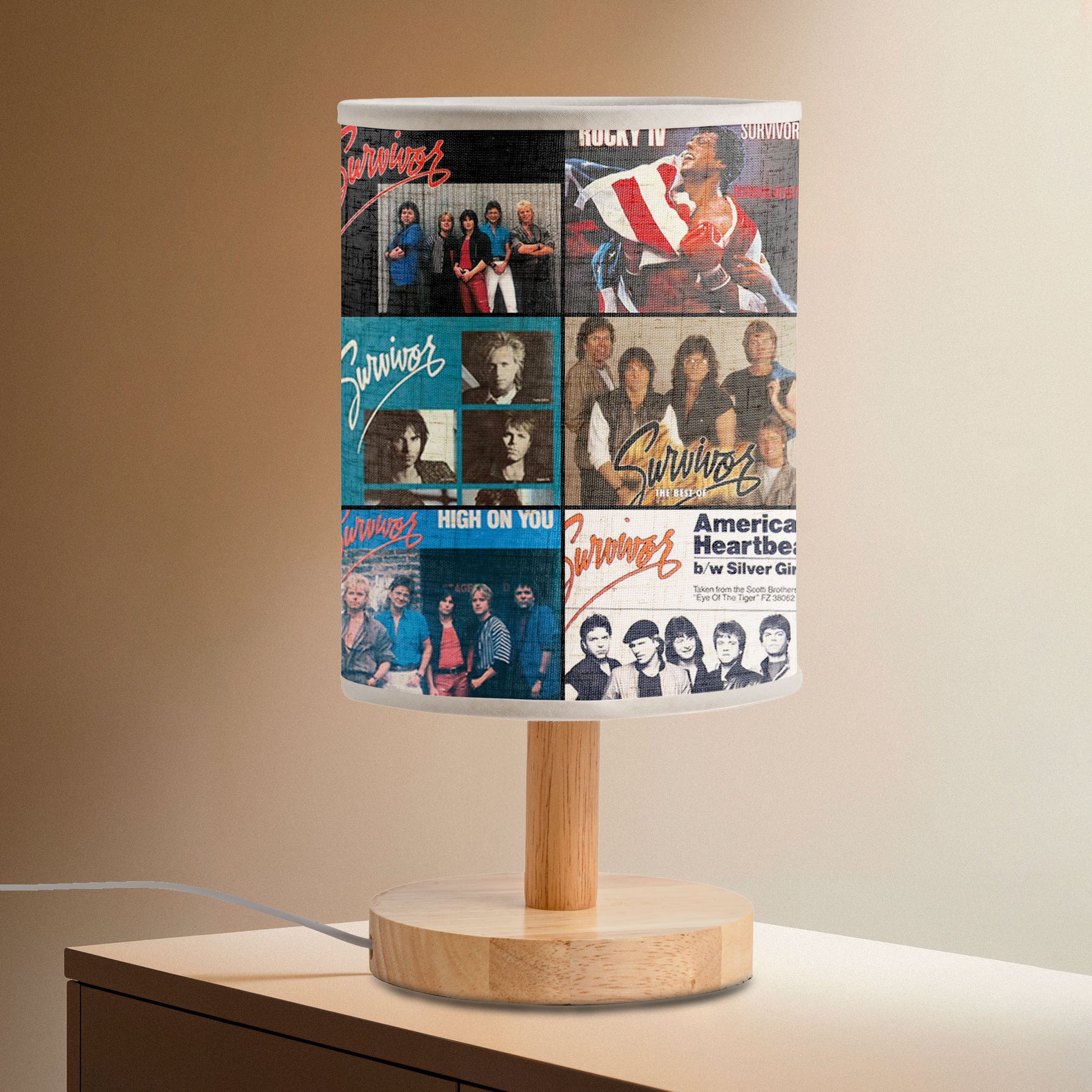 Bring the power of 80s rock into your home with this Survivor Album Art Table Lamp. Showcasing legendary covers from albums like Eye of the Tiger, Premonition, and Caught in the Game, this lamp captures the adrenaline and passion that made Survivor an unforgettable name in rock history.
