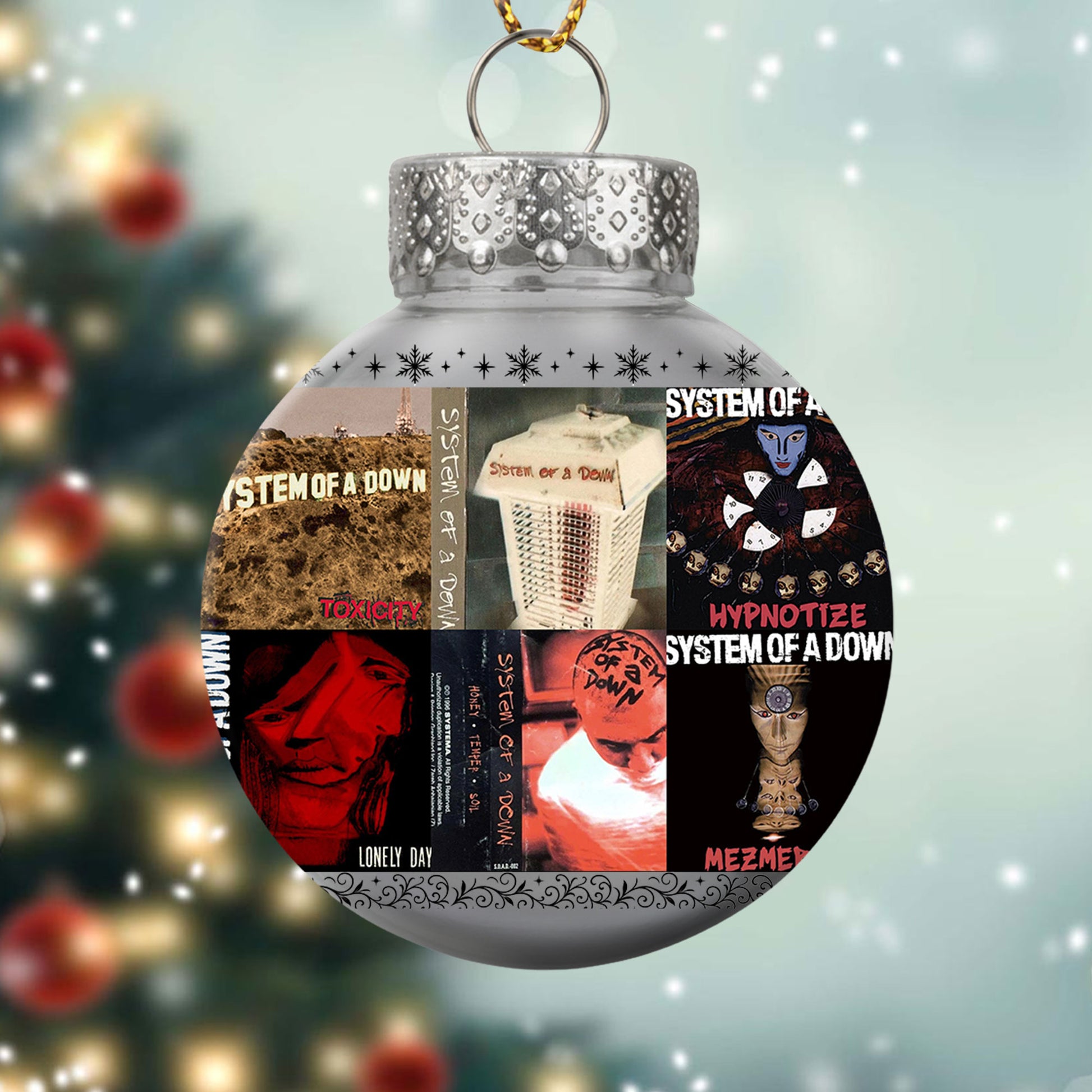 Bring intensity and artistry to your holidays with this System of a Down Ball Ornament. Featuring the band’s most iconic album covers, this ornament captures their fearless spirit and creative energy. It’s the perfect Christmas gift for fans who love their music raw, rebellious, and unforgettable — a standout piece for any rock-inspired tree.