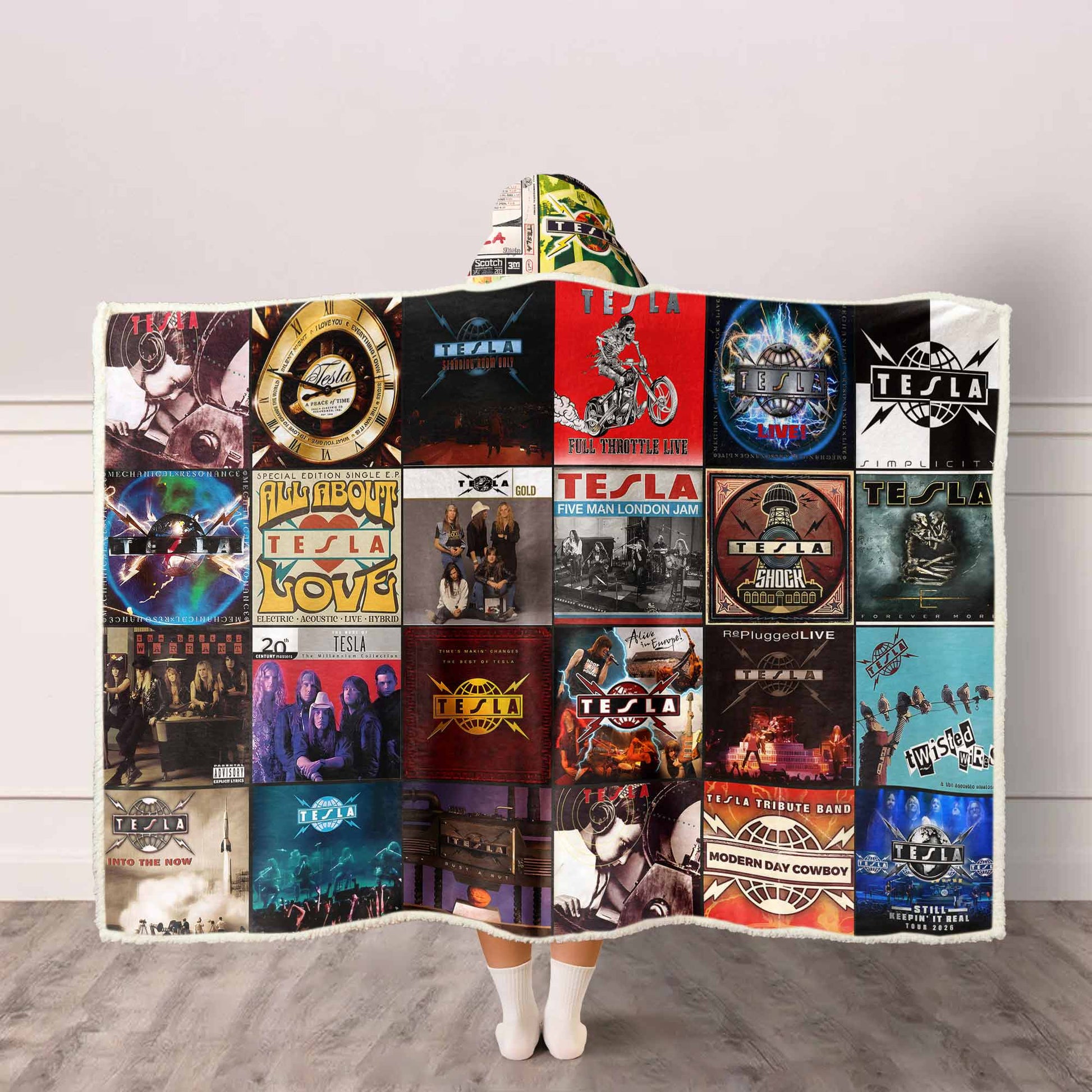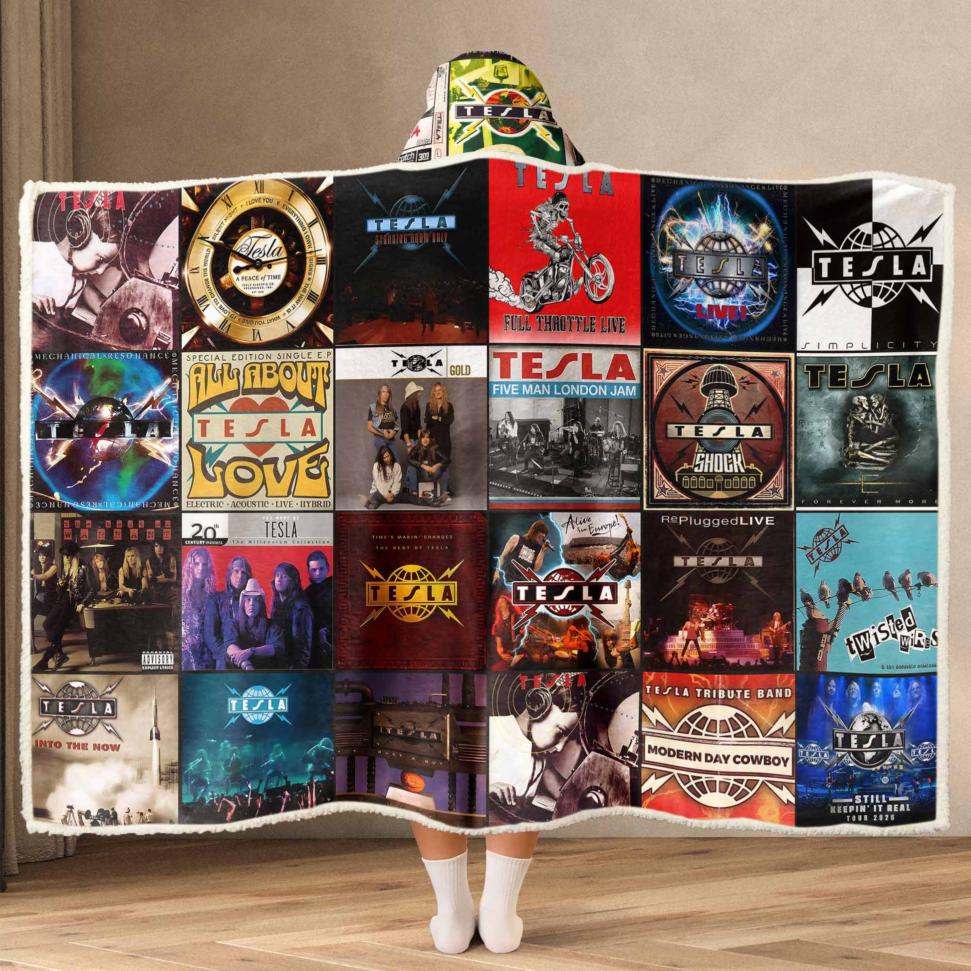 This wearable hooded blanket is made for true Tesla fans — the ones who still feel that electric rush when Modern Day Cowboy, Love Song, or Signs kicks in. Wrapped in a powerful collage of the band’s most iconic albums, live tours, and classic hard-rock visuals, it brings back the grit, soul, and unmistakable energy that define their sound.