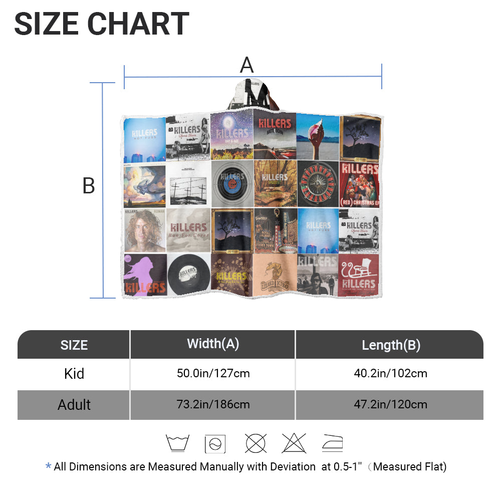 Wrap yourself in the rhythm of The Killers with this wearable hooded blanket featuring a vibrant collage of their most iconic album covers. From Hot Fuss to Battle Born, every square recalls an era of anthems, lights, and late-night drives. Perfect for fans who still feel the heartbeat of Mr. Brightside and the spirit of timeless rock.