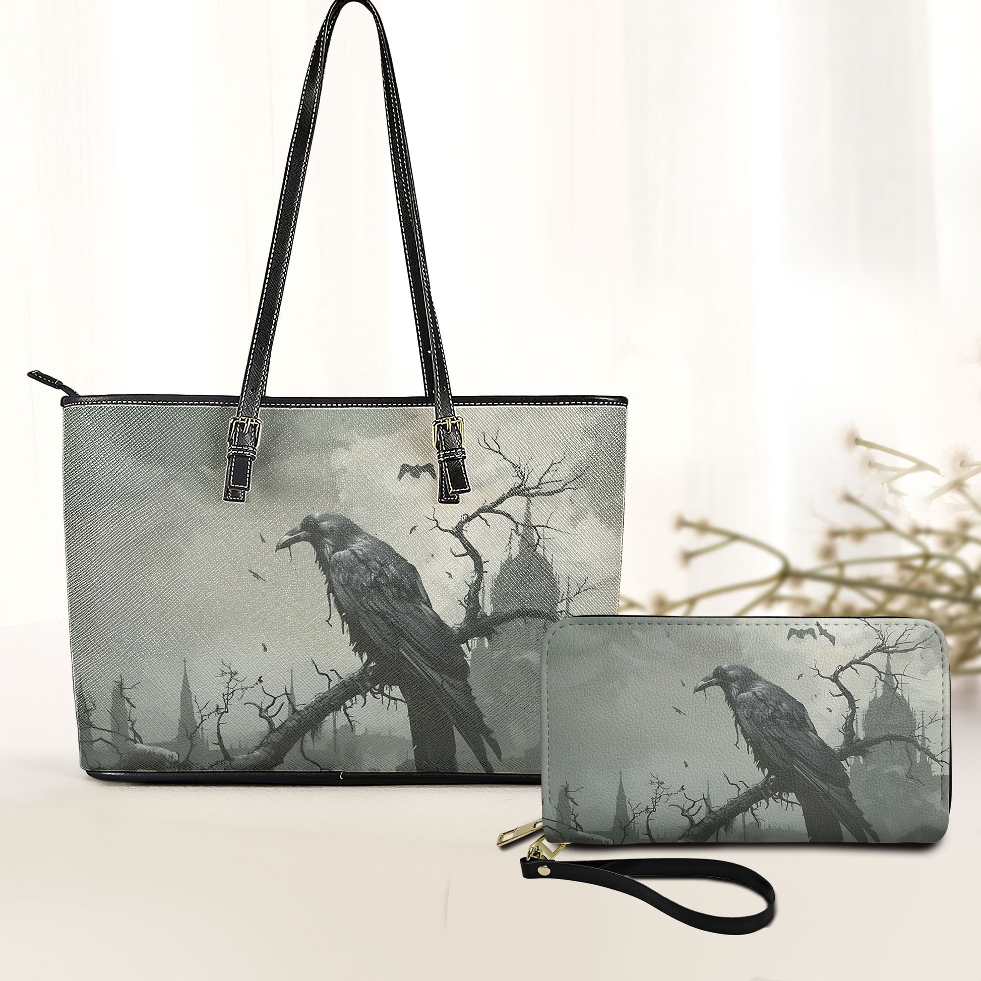 Unveil your dark elegance with this Raven-inspired handbag and wallet set, featuring haunting gothic artwork of the iconic black crow perched on twisted branches. The design draws inspiration from classic dark poetry and literature, making it a statement piece for fans of gothic fashion and mysterious aesthetics.