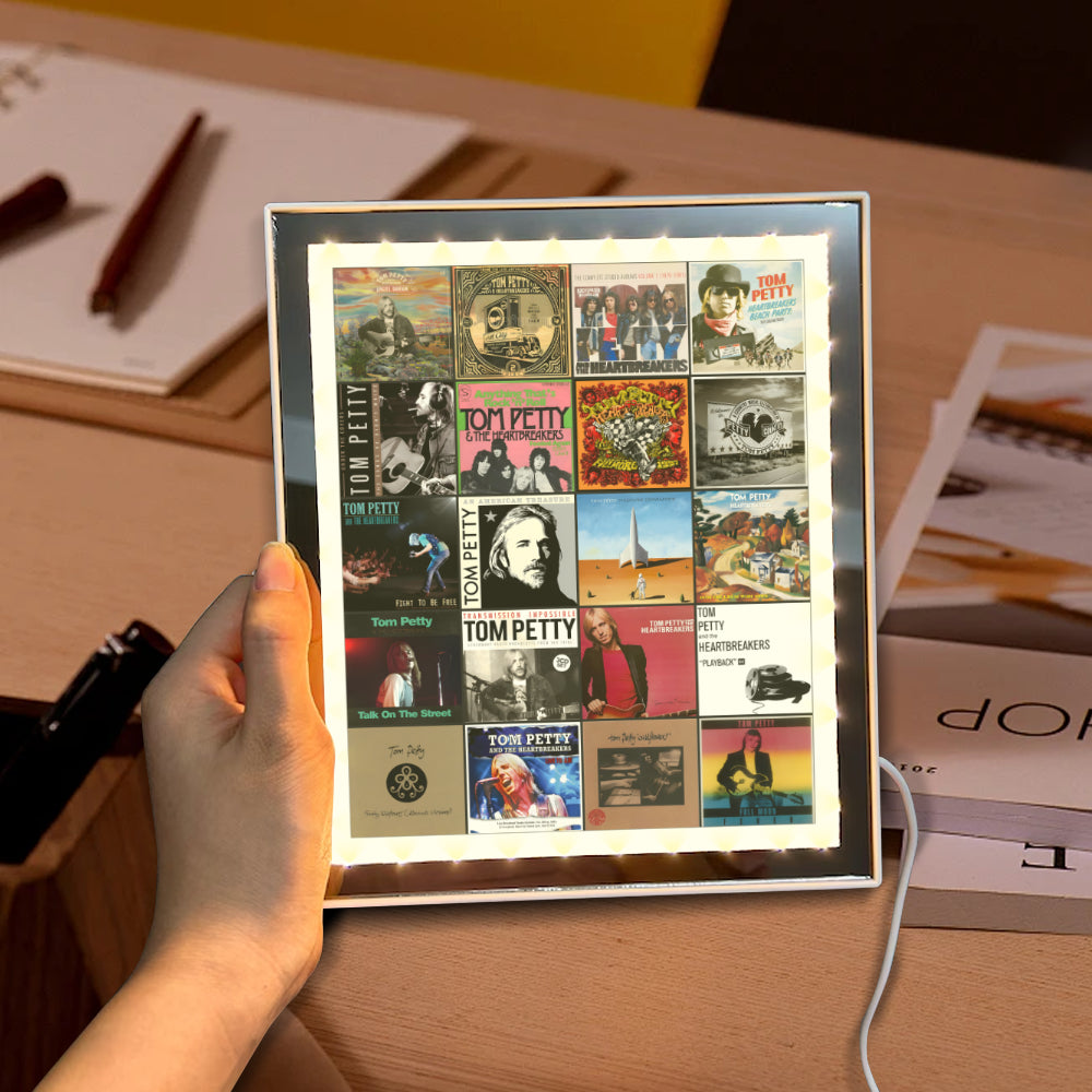 Honor the legendary spirit of Tom Petty with this Acrylic Light Mirror, designed to bring both function and nostalgia into your space. When turned off, it serves as a high-definition mirror — perfect for daily use. When switched on, it transforms into a glowing piece of art, illuminating a vibrant collage of Tom Petty’s most iconic albums.