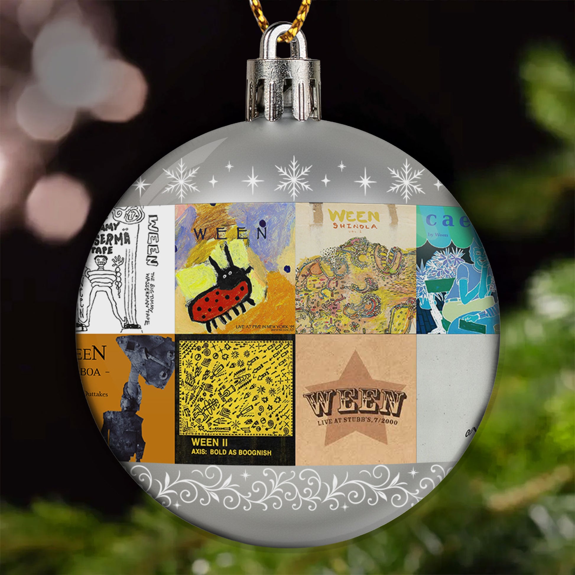 Celebrate the brilliantly bizarre world of Ween with this eye-catching Ball Ornament! Featuring a vibrant collage of their most iconic and offbeat album covers, it perfectly captures the band’s genre-bending genius and playful spirit. The deep blue ornament, adorned with delicate snowflakes, adds a festive touch to Ween’s quirky chaos. A must-have collectible for fans who love music that’s as unpredictable and colorful as the holidays themselves. Bring a little Boognish magic to your Christmas tree this year!