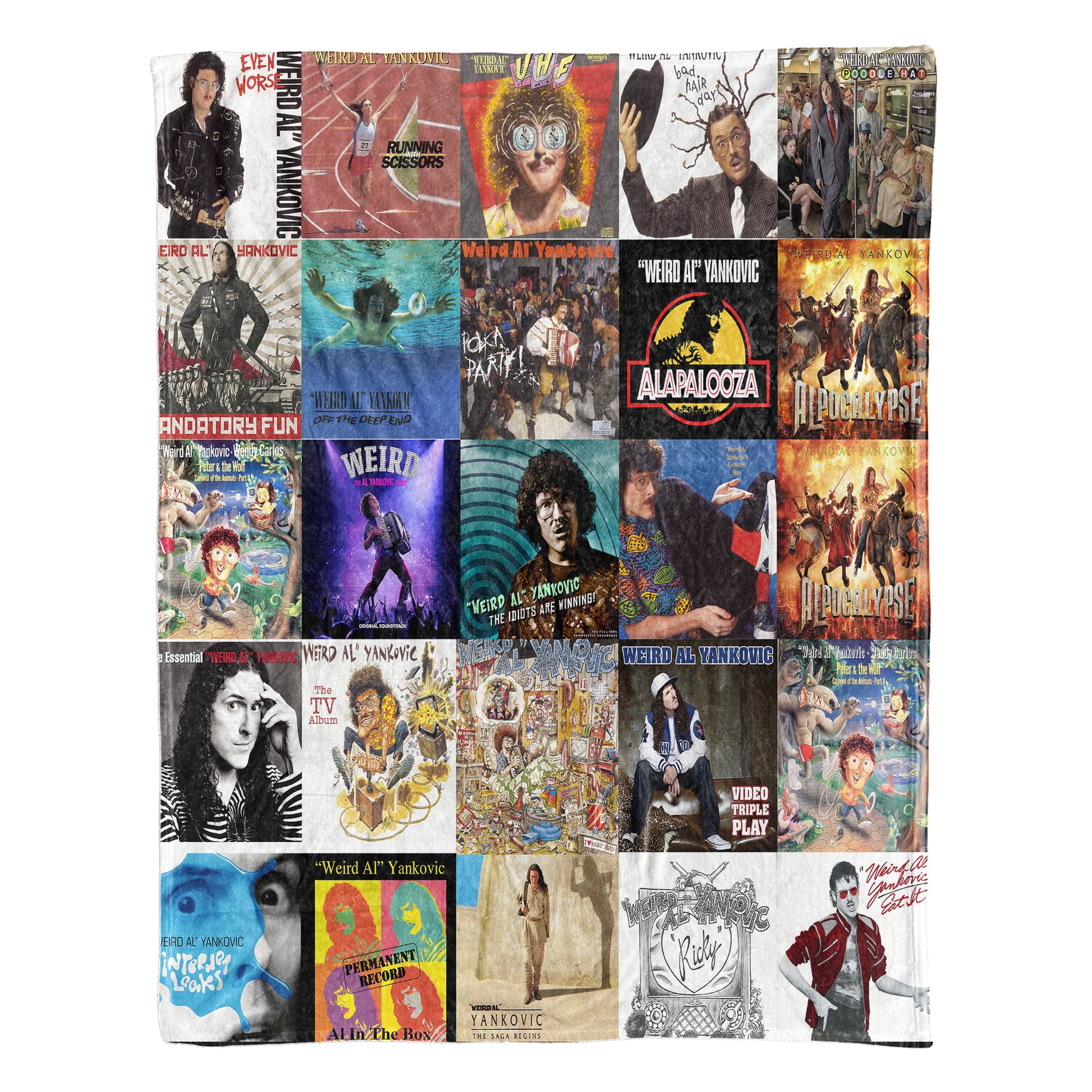 Dive into the hilarious, clever world of Weird Al with this vibrant album-collage blanket. It captures decades of parody, creativity, and pure fun—everything fans love about his iconic, off-beat genius. A cozy, nostalgic piece perfect for anyone who grew up laughing with his music.