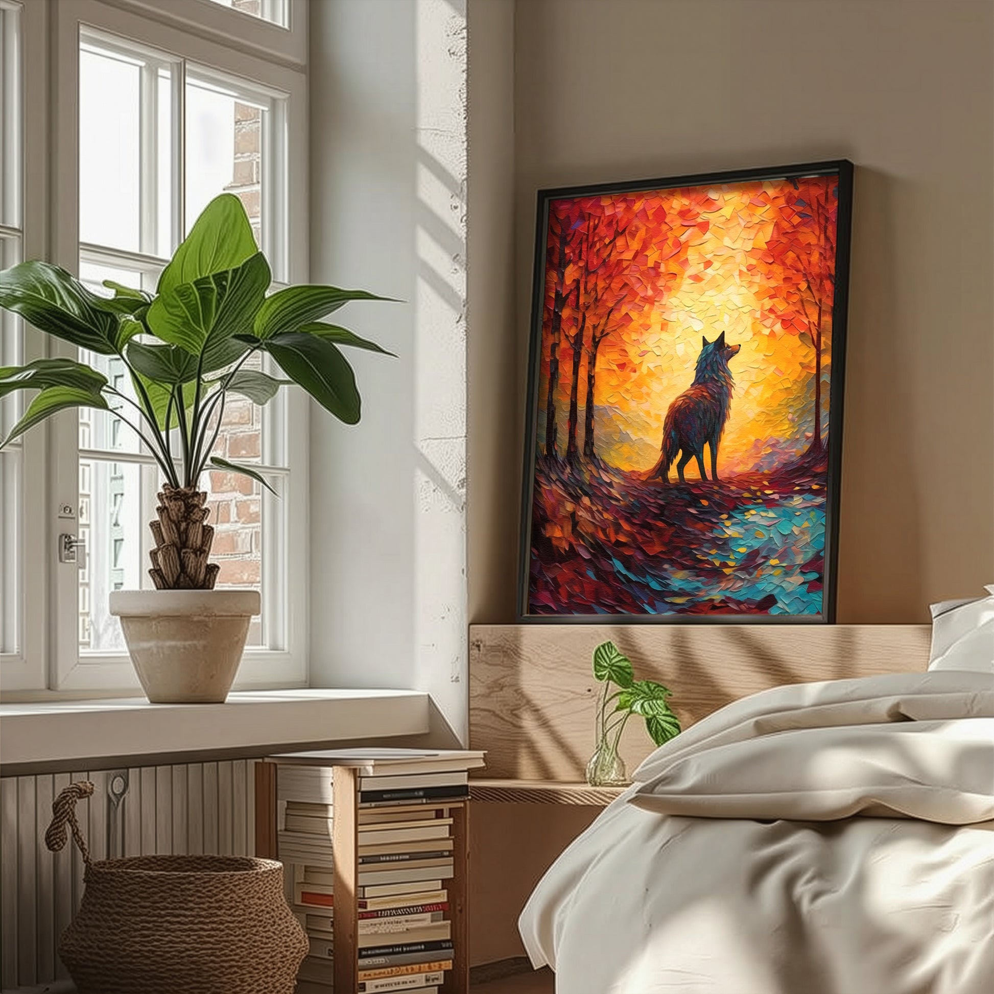 A stunning artwork of a lone wolf standing in a forest of fiery autumn trees, bathed in the warm glow of golden light. Painted in a vibrant, textured style, this piece captures both the wild spirit and serene beauty of nature. Perfect for bringing color, depth, and inspiration to any room.
